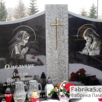 Высокий фигурный памятник с тюльпанами из черного гранита, лицевая сторона оформлена авторской художественной гравировкой.