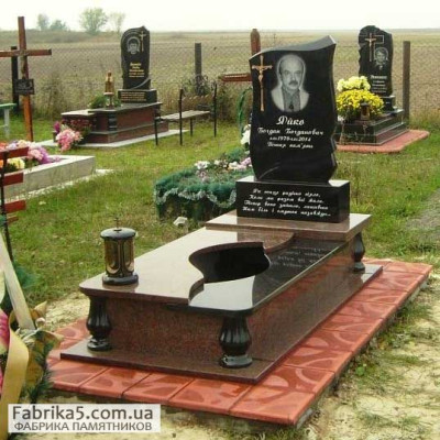 Элитный комплекс из красного и черного гранита двоих человек. Комплекс изготовлен из гранита Лезники и Габбро, По периметру ограда с фигурными цоколями, угловая лавочка и круглый стол на точеных ножках