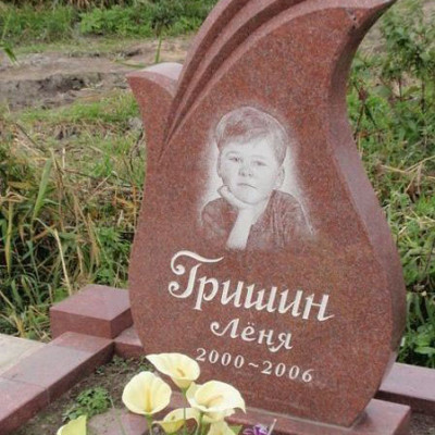 Оригинальный детский памятник из гранита. Особенность памятника это цветная гравировка портрета ребенка с крылышками ангела с обрезкой по контуру.