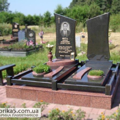 Элитный двойной памятник с католическим крестом. Модель №75-009 изготовлена из больших надгробных плит красного гранита