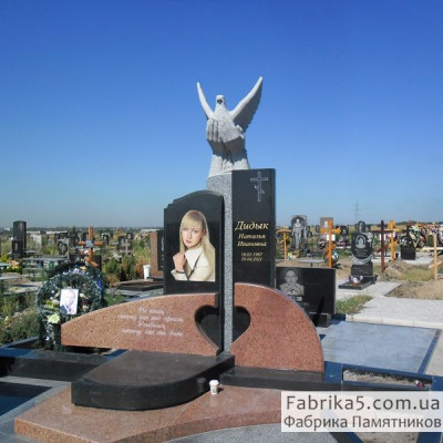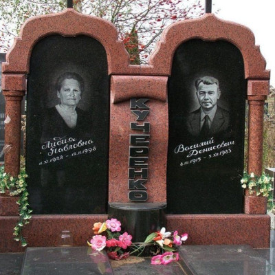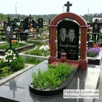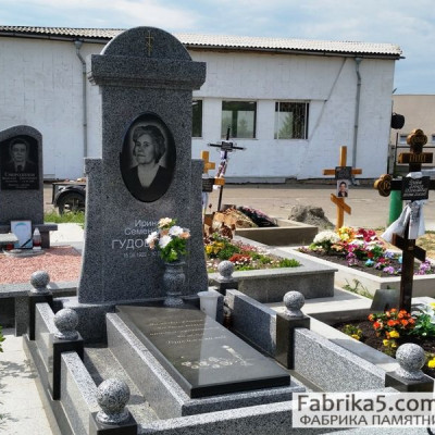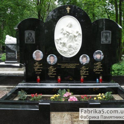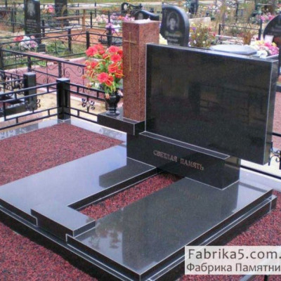 Элитный горизонтальный памятник для семейного захоронения. Элитная массивная ограда из красного лезниковского гранита и черного габбро. Тип каскадный, фигурный с разновысокими столбиками. Ограда на 3 могилы