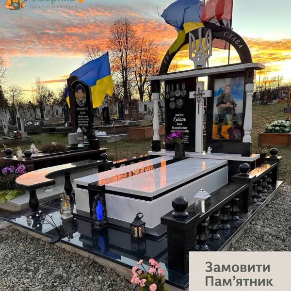 Элитный памятник для Героя, выполненный в виде момориального комплекса. Комполекс сочетает контраст чёрного гранита и белого мрамора Каррара, подчёркивая мемориальную архитектурную в строгом стиле. Центральным элементом является двойная вертикальная стела с цветным портретом, дополненная колоннами и аркой с национальной символикой - Герб Украины из мрамора.