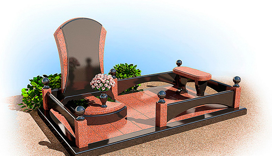 Элитный комплекс из красного и черного гранита двоих человек. Комплекс изготовлен из гранита Лезники и Габбро, По периметру ограда с фигурными цоколями, угловая лавочка и круглый стол на точеных ножках..