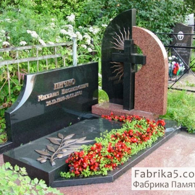 Оригінальна пам'ятка з хрестом та закритим надгробком на одного. Комбінований тип з чорного та зеленого граніту на могилу чоловіка.