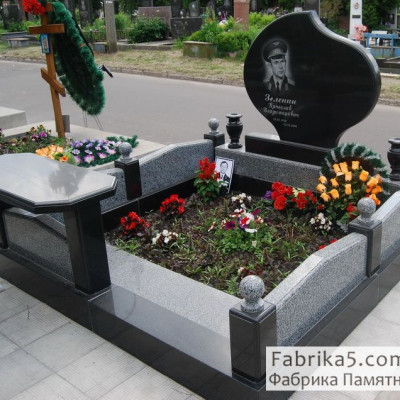 Гранітний комплекс на одиночну могилу з огорожею із граніту. Стела пам'ятника виконана у формі сльози із чорного та сірого граніту.