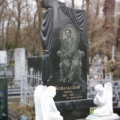 Престижний пам'ятник із чорного граніту габро. Модель №13-057 складається із трьох деталей: стеля, підставка, фігурна надгробна плита.