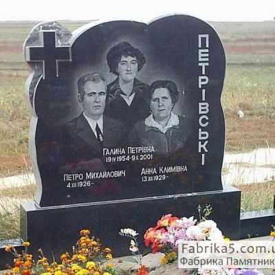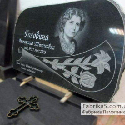 Пам'ятник чорного граніту з полірованими тюльпанами на скелі.