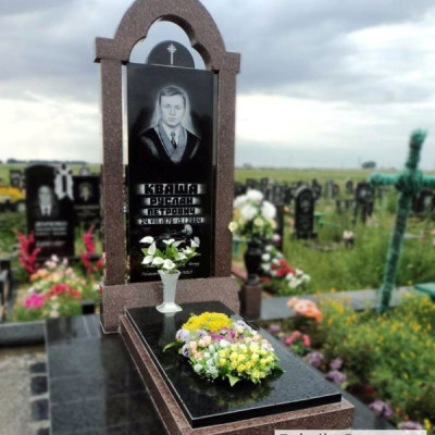 Подвійний пам'ятник із фігурними стелами із чорного граніту. Модель №23-009 виконана у католицькому стилі.